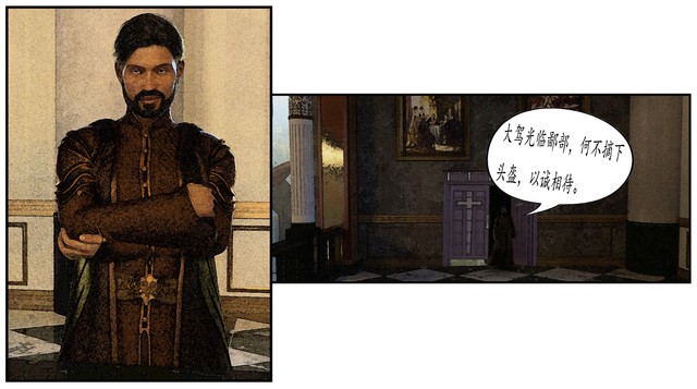 “大驾光临鄙部,何不摘下头盔,以诚相待。”阴鸷的中年男声从二楼敞开的门内传出,接着“主人”缓缓走了出来。