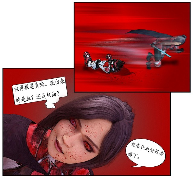 此刻围攻上来的那群机甲斗兵仅剩一人生还。曌踩其胸,借力蹬出后空转体720°,“呀!”下落时凰鸣斜劈,以骑龙步落地,那机甲斗兵则从肩到腰被劈成两段。(剑技·筋斗凰翔·落)