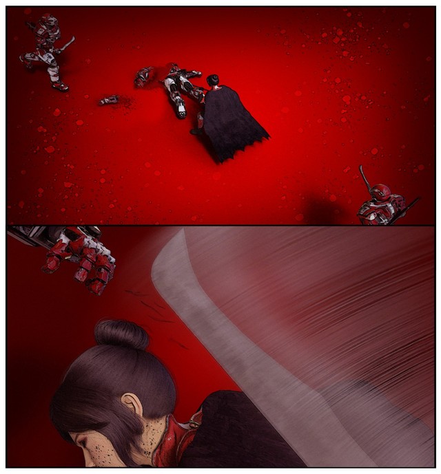 无头尸体即将跪倒时,曌以左脚猛踩其胸,以此为支点向左侧举刀冲来的机甲斗兵扑去。