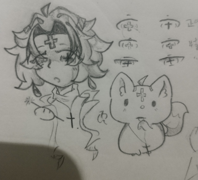 他抬起头,像是在思考着什么,随后又垂眸,眼里亮晶晶的,双眼中的十字架都成了镂空样