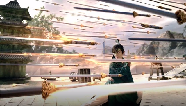 趁狼妖不备,他一跃而上,变出命剑刺向狼妖,一时间无数的剑严阵以待,演绎出了万箭穿心一幕