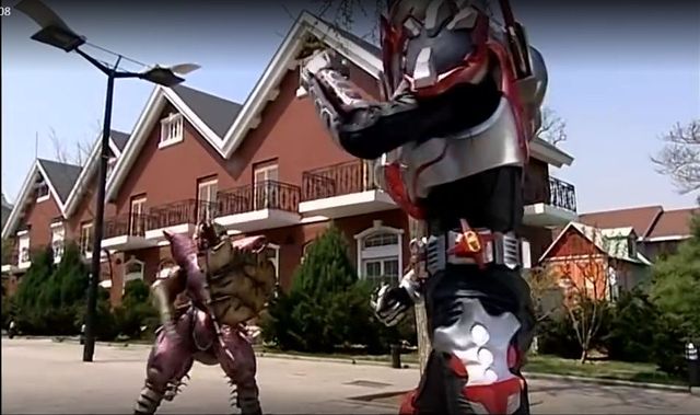 炘南变身成炎龙铠甲和异能兽战斗着